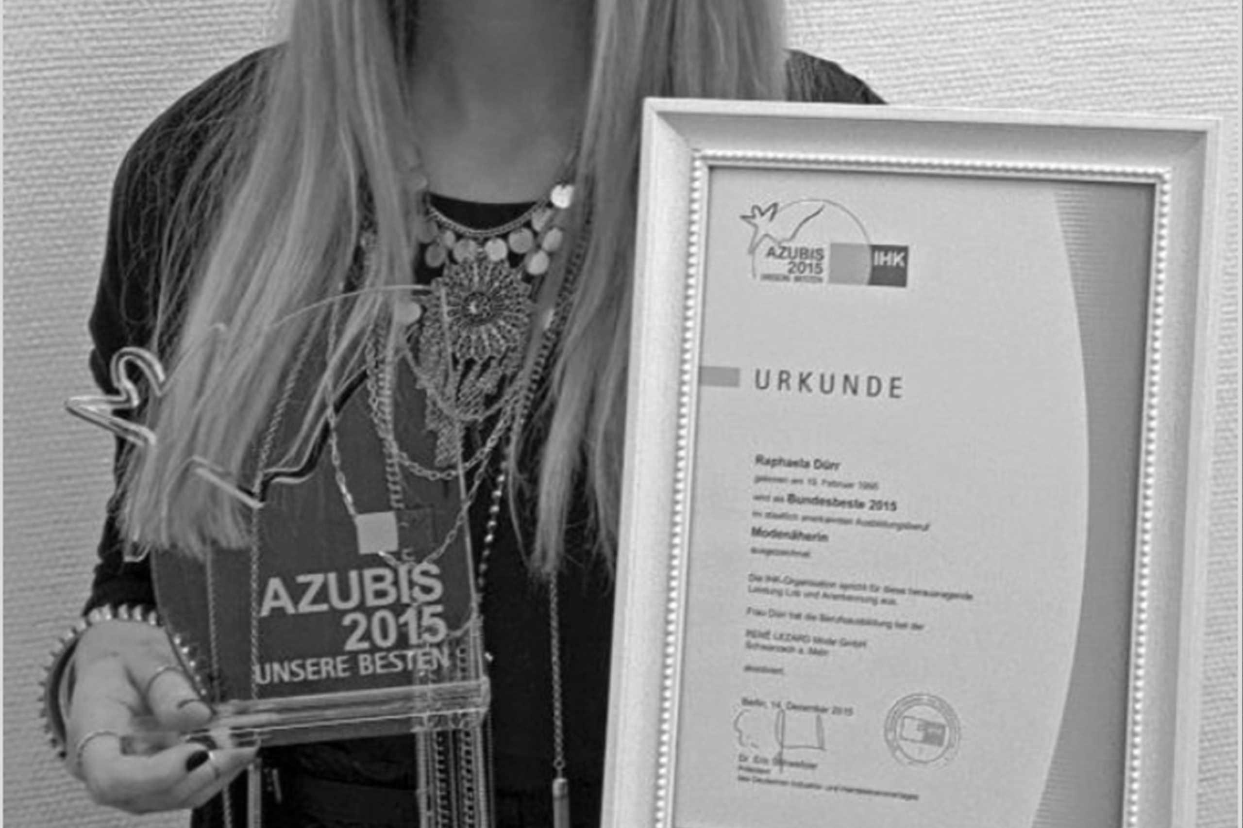 Die Geschäftsführung von RENÉ LEZARD freut sich sehr darüber, dass Raphaela Dürr von der IHK als beste Modenäherin-Auszubildende des Jahres 2015 ausgezeichnet wird.